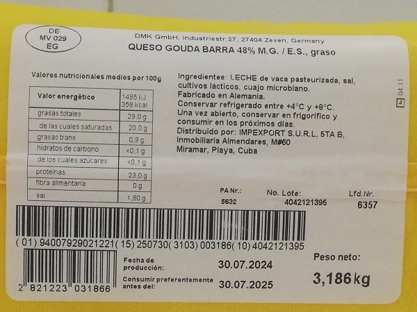 El Queso Gouda Barra 48% M.G. fabricado en Alemania es una exquisitez láctea con cremosidad intensa y notas dulces, elaborado bajo los más altos estándares europeos.